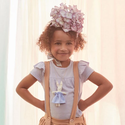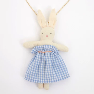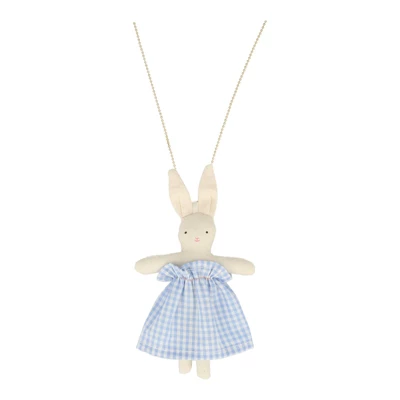 If you’re looking for a gift for a little person that is different from the norm, then you’ll love this amazing bunny necklace! Featuring a beautifully crafted cotton bunny wearing a gorgeous gingham dress. She delicately hangs from a gold-tone chain. A wonderful present for Easter, or as a special surprise any time of the year! Cotton padded doll with gingham dressNeon detailGold enamel bead chain Pack dimensions: 3.125 x 6 x 0.5 inches