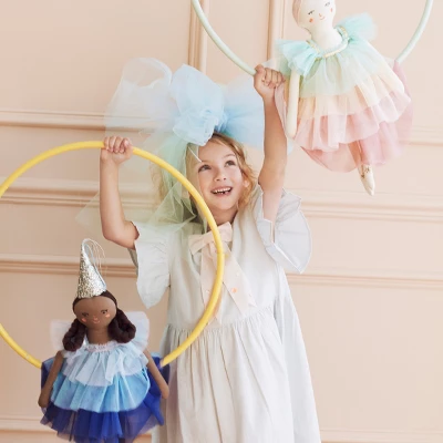 Esme is a very stylish fabric doll, who is perfect for imaginative play and hugs. She has beautiful brown plaited hair, a ruffled blue dress and a glittering silver princess hat with ribbons (which clips on and off, and can be worn by kids too!).
