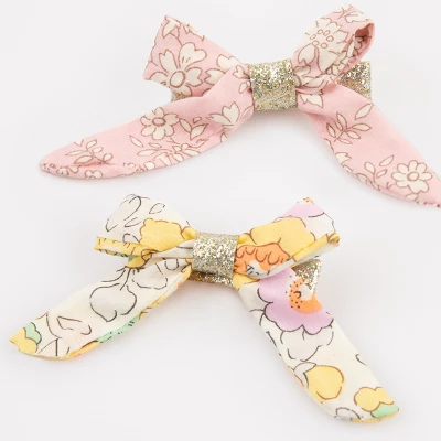 Bows are a charming hair accessory and these are even more delightful as they’re made with a gorgeous Liberty floral fabric, with glimmering glitter gold fabric detail. Wear the set of four all at once for a statement look, or mix and match according to your outfit or mood! Cotton fabric with gold glitter fabric detail. Gold tone crocodile clip. Made with Liberty fabric. Set of 4. Pack dimensions: 3.625 x 6 x 0.625 inches