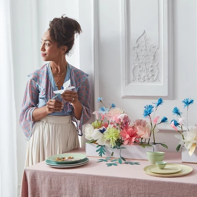 - The centerpiece has 21 flowers, crafted from tissue paper, crepe paper and art paper, in shades of pink, blue, white, yellow and green