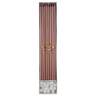 Unwrapping presents, cake, blowing out candles. Some things never lose their appeal, no matter how many birthdays pass you by, so why not add a little extra touch of luxury to your party with this set of sixteen elegant rose gold candles. Rose gold foil detail. Plastic holders. Pack of 16.