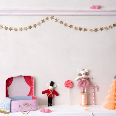 This is a wonderful gift for children who love ballet, and will give hours of imaginative play. It features a little suitcase, which opens to reveal a theatre backdrop and 2 adorable fabric ballet dancer mice. The female mouse has a beautiful pink tulle dress, removable wings, a tiara and shoes. The male mouse is dressed in a soldier outfit, with a felt jacket and hat. Also included is a delightful mini fringed blanket, to use as a prop.